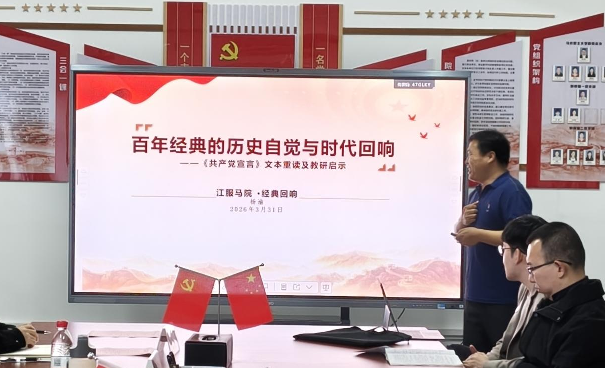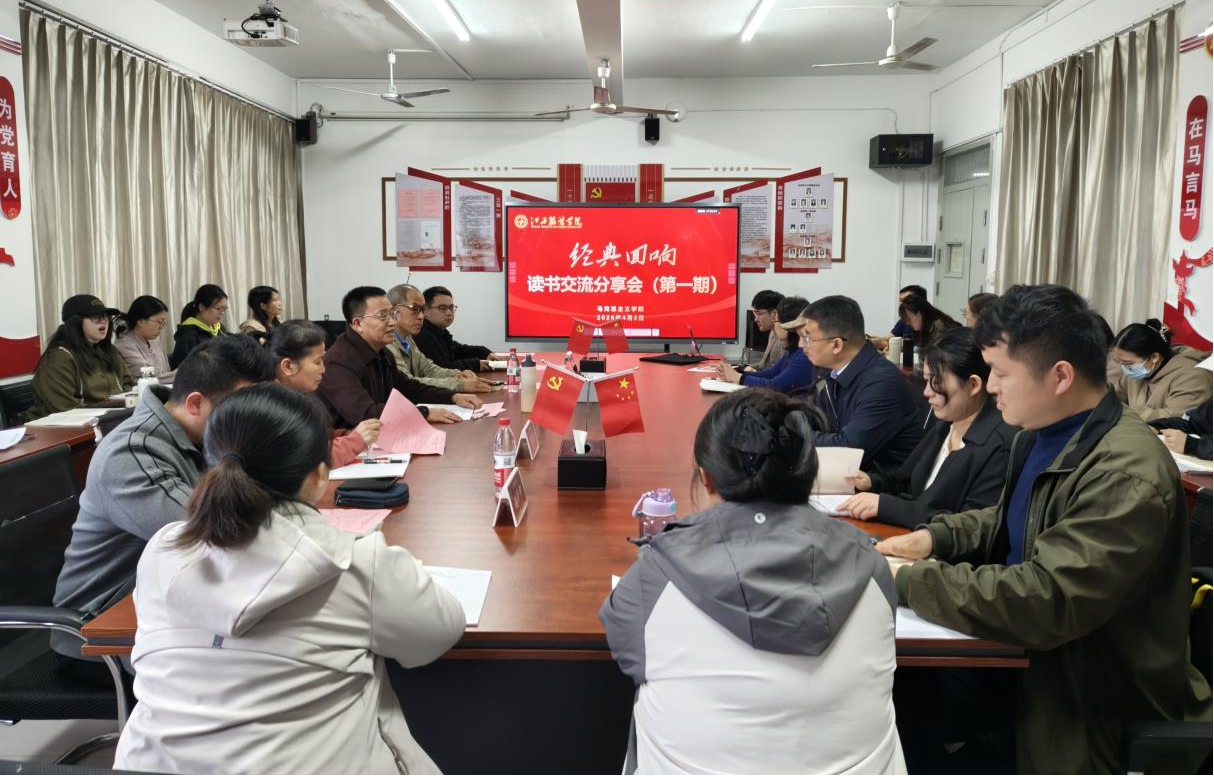 (马克思主义学院 讯)为深入学习贯彻习近平总书记“希望全社会都参与到阅读中来,形成爱读书、读好书、善读书的浓厚氛围”的指示精神,营造书香浓郁的校文化氛围,持续提升思政课教师理论素养与教研能力,2026年4月2日下午,马克思主义学院“经典回响”读书交流分享活动(第一期)在主教学楼240会议室召开。商学院院长刘戒骄、人文学院潘泽中老师应邀出席,学院全体教职工参与活动,活动由马克思主义学院院长肖杰主持。
