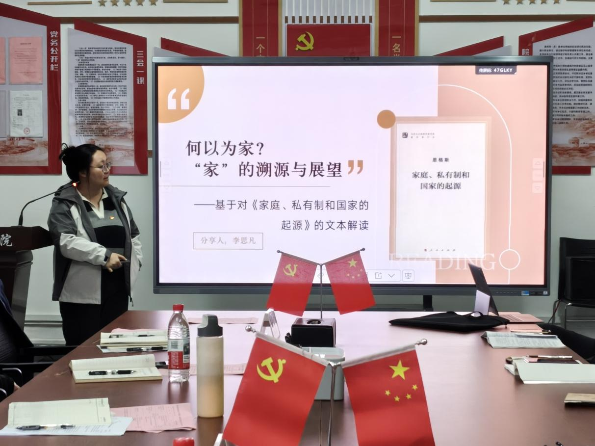 李思凡老师围绕《“家”的溯源与展望——基于〈家庭、私有制和国家的起源〉文本解读》展开交流。她以历史唯物主义为指引,解析家庭形态演变、私有制产生等内容,清晰勾勒人类社会从原始社会向阶级社会演进的历史脉络,交流了对家庭的未来走向的思考,并结合教学科研实际分享研究思考,让抽象原理变得具体生动。